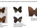 During an extensive ongoing campaign to assemble a species inventory and DNA barcode library of the Lepidoptera of Area de Conservacion Guanacaste (ACG), Costa Rica (http://www.bolinfonet.org/casestudy/index.php/display/study/20), a problem arose concerning the identity of Taygetis andromeda (Cramer, 1776). This common satyrine, recorded throughout much of South and Central America, is listed as T. andromeda in the standard butterfly guide for Costa Rica (DeVries 1987) and was inventoried under this name in the ACG for 25 years (Janzen & Hallwachs, 2010; http://janzen.sas.upenn.edu/). A high intra-specific sequence divergence was observed between two clusters of "T.andromeda" DNA barcodes - 3% compared with 0.5%, the average conspecific K2P distance reported for Lepidoptera by Hajibabaei et al. (2006; http://www.pnas.org/content/103/4/968.full) - prompting an investigation of the identity of the clusters.
